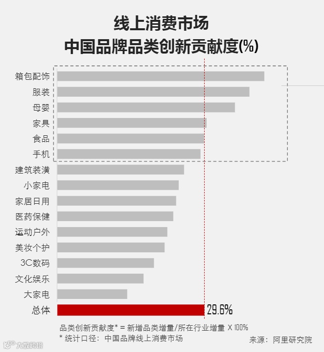 阿里研究院数据显示,品类创新总体贡献度达到29.6%,中国消费品牌通过品类创新推动了市场规模的扩大。