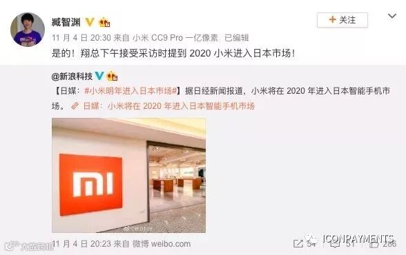昨天,《日经新闻》称小米将于 2020 年进入日本智能手机市场。随后,小米手机产品市场总监臧智渊在微博上确认了这一消息。