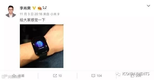 小米电视(空调)部总经理李肖爽在微博上分享了小米手表的佩戴图片。新品将于 11 月 5 日发布会上发布。