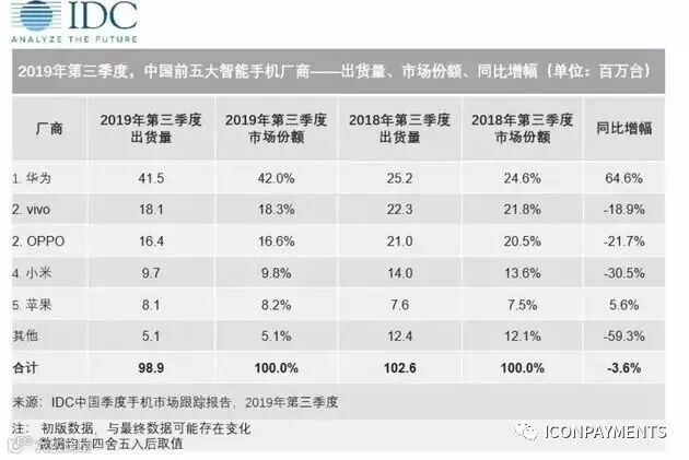 新浪科技消息,IDC 数据显示,2019 年第三季度,中国智能手机市场出货量约 9890 万台,同比下降 3.6%,降幅较今年上半年有所收窄,其中出货量排名前五为华为(4150 万台)、vivo(1810 万台)、OPPO(1640 万台)、小米(970 万台)、苹果(810 万台)。