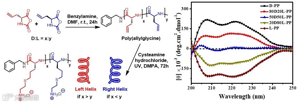 抗菌多肽(AMP)领域存在一种主流思路:通过设计让分子形成 α-螺旋、β-折叠等有序二级结构,以强化面两亲性并提升膜作用效率。该论文首先以严格的立体化学系列方式检验这一假设:作者通过 N-羧基酸酐(NCA)聚合与后续巯基-烯点击修饰,获得 D/L 比例明确的阳离子多肽库 (图1),并用圆二色谱(CD)评估构象。结果显示:除 50D/50L 外,其余组成在模拟膜环境下均呈现螺旋样信号;而 50D/50L 在膜模拟条件下缺乏清晰的有序结构。