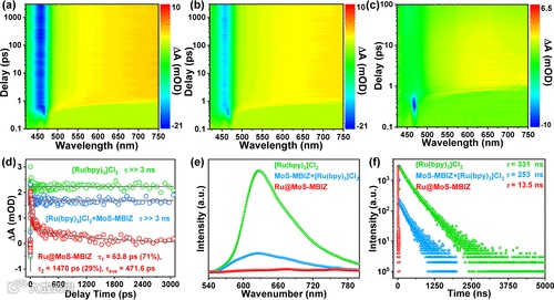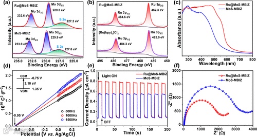 X射线光电子能谱(XPS)显示Ru@MoS-MBIZ中Mo 3d峰向低结合能偏移0.4 eV,Ru 3p峰向高偏移0.3 eV,证实Ru到Mo的金属间电荷转移。UV−vis显示Ru@MoS-MBIZ吸收扩展,带隙为2.10 eV(MoS-MBIZ为2.38 eV)。UPS和Mott−Schottky测试确认其n型半导体特性,导带最小值(CBM)为−0.75 V vs NHE,适合H⁺/H2还原。瞬态光电流和EIS显示Ru@MoS-MBIZ的电荷分离和转移效率更高。飞秒时间分辨瞬态吸收(fs-TA)显示Ru@MoS-MBIZ中基态漂白(GSB)和激发态吸收(ESA)的加速衰减,表明超快电荷分离。稳态和时间分辨光致发光(PL)显示Ru@MoS-MBIZ的发射强度显著衰减,证实电子−空穴复合抑制和快速载流子迁移。