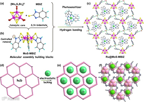 首先通过[Mo3S7Br6]2-与MBIZ在溶剂热条件下反应,制备了MoS-MBIZ晶体。基于MoS-MBIZ作为结构原型,进一步引入[Ru(bpy)3]Cl2,合成了Ru@MoS-MBIZ。该化合物保留了母体分子的配位几何和簇核结构,但MBIZ配体脱质子化,使簇从阳离子转为阴离子。这种质子自适应行为实现了对[Ru(bpy)3]2+模板掺入的电荷平衡,促进光敏基元的稳定静电组装。脱质子氮原子与甲醇客体形成定向氢键,推动形成具有hcb拓扑的(3,3)-连接2D阴离子超分子网络。这是首个基于Mo−S簇的氢键框架,其中相邻MoS-MBIZ簇通过氢键互连。更重要的是,[Ru(bpy)3]2+单元通过协同静电锚定和局部氢键微环境限域于簇矩阵的孔道中。这种静电锁定构型提供了一种简单而强大的分子策略,实现光敏中心和催化单元的有序共组装,促进[Ru(bpy)3]2+与[Mo3S7(MBIZ)3]2-之间的高效界面电荷转移。