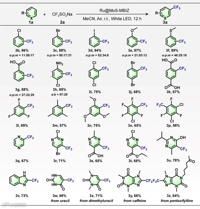 相比[Ru(bpy)3]Cl2(53%)和MoS-MBIZ的物理混合(66%),Ru@MoS-MBIZ(86%)表现出更高光催化三氟甲基化活性。自由基捕获和EPR实验证实了CF3•和O2-•参与。机制:光激发产生电子−空穴对,空穴氧化CF3SO2Na产生CF3•,电子还原O2产生O2⁻•,后者氧化环己二烯基自由基并脱质子形成产物。同时,该反应对超过25种(杂)芳香族底物均表现出广泛的适用性,能够以中等至优异的收率得到三氟甲基化产物。