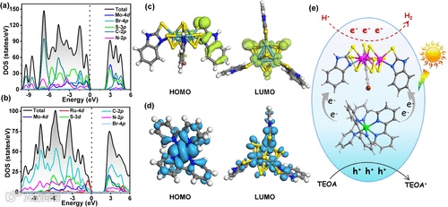 在可见光下,Ru@MoS-MBIZ的产氢速率高达46 mmol g-1 h-1。相比于MoS-MBIZ(0.39 mmol g-1 h-1)和光敏剂物理混合(10.2 mmol g-1 h-1),其活性更高,且优于大多数晶态光催化剂。五次循环显示催化剂的稳定性能,后催化表征(SEM、TEM、PXRD、FT-IR、XPS)确认结构完整性。密度泛函理论(DFT)显示Ru@MoS-MBIZ的VBM主要由Ru-4d贡献,CBM由Mo-4d、S-3p等混合。HOMO位于[Ru(bpy)3]2+,LUMO位于[MoS-MBIZ]⁻,促进空间分离和转移。机制:可见光激发[Ru(bpy)3]2+,电子转移到Mo−S位点还原H⁺,[Ru(bpy)3]3+由TEOA还原。