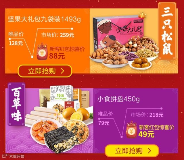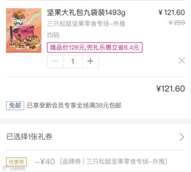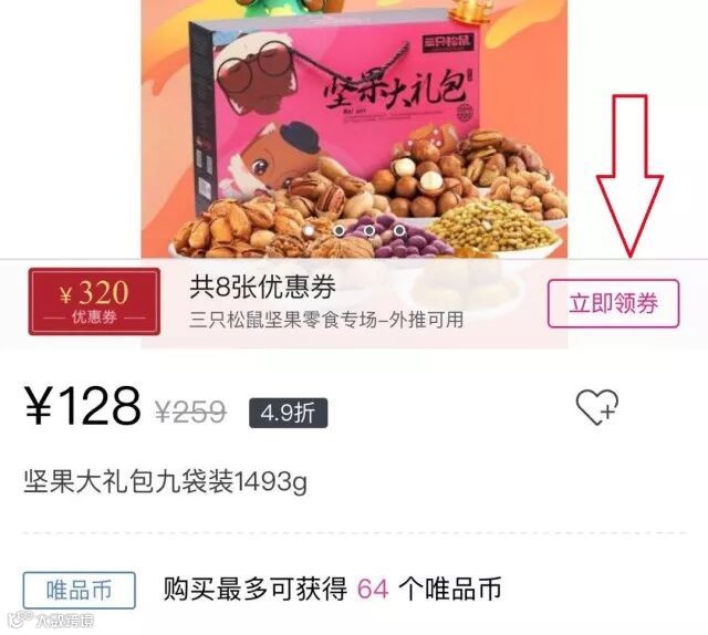 坚果,年货必备。三只松鼠特选坚果大礼包市场价259元,唯品会特价128元,再送上兜礼折上折。还没完!