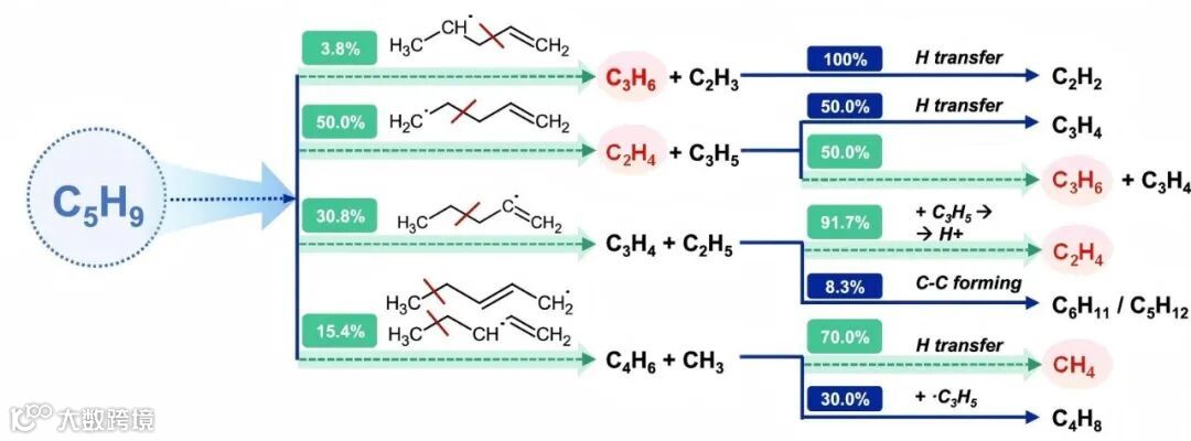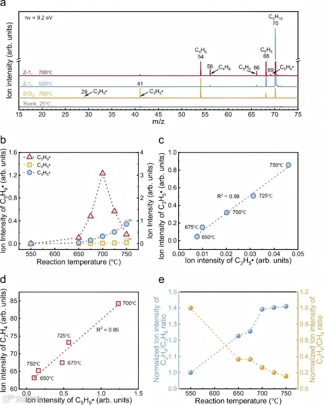 研究团队利用合肥国家同步辐射实验室的真空紫外光电离质谱(SVUV-PIMS)在线监测反应过程,首次直接捕捉到关键气态中间物种——C5H9•。该物种信号随温度变化,在700℃最强,并与乙烯生成量高度相关,独立于传统热裂解路径。