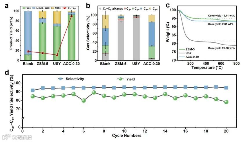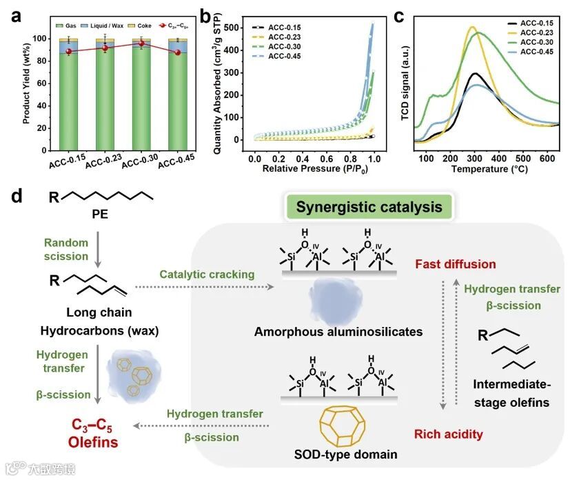 以LDPE为模型底物,ACC-0.30表现出优异的催化效率。在440℃、C/F=10/1的优化条件下,其C3-C5轻质烯烃产率达88.08 wt%,选择性高达94.92%,收率分别是商业ZSM-5和USY沸石的13倍和37倍(图2a-b)。整个ACC-x系列均保持了91%以上的高选择性,且收率随SiO2添加量变化呈“火山型”变化,ACC-0.30表现最优(图3a)。此外,该催化剂展现了极强的抗积碳能力,20次连续循环后积碳量仅为1.13 wt%,且烯烃选择性始终稳定在约95%,具备较强的工业化潜力(图2c-d)。