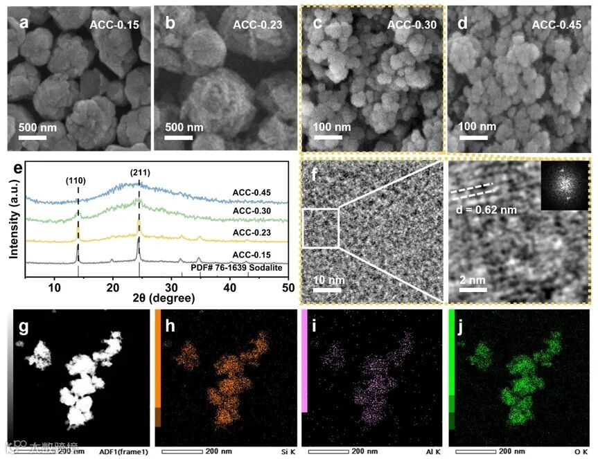 首先研究团队通过水热法合成了一系列不同SiO2添加量的ACC-x催化剂。SEM显示,随着SiO2添加量增加,催化剂由不规则微米级团聚体逐渐演变为分散均匀的球形颗粒(图1a-d)。XRD证实x为0.15-0.23时以结晶态SOD沸石为主,而x=0.30时特征峰显著减弱展宽,标志着无定形基质与短程有序域复合结构的形成;至x=0.45时完全转变为无定形相(图1e)。iDPC-STEM图像直观捕捉到了ACC-0.30中0.62 nm的SOD (110)晶格条纹,结合均匀分布的Si、Al、O元素能谱(图1f-j)以及FTIR/Raman光谱对SOD结构基元的验证,确证了短程有序SOD型沸石嵌入无定形基质的复合结构。