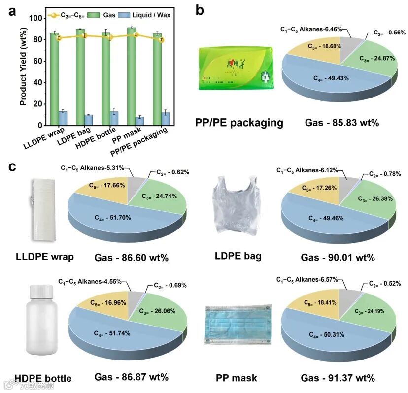 ACC-0.30催化剂具有较广的底物适用性。在处理LLDPE、HDPE、PP等树脂原料时,C3-C5烯烃选择性超92%,产率达83 wt%以上。针对含有色剂、塑化剂等复杂添加剂的消费后聚烯烃废弃物(如LLDPE保鲜膜、HDPE药瓶、PP口罩和PP/PE混合包装塑料),该催化剂仍能实现85 wt%以上的气体产率,C3-C5烯烃选择性均超92%(图4),证明了该催化剂在处理实际复杂废弃物方面具备实际应用前景。