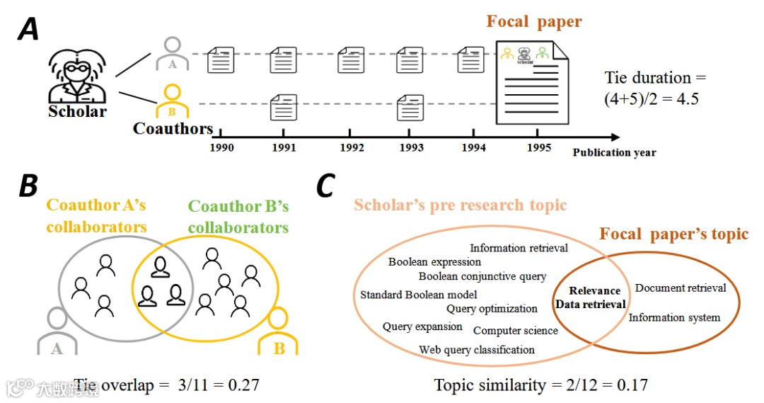 获奖者的合作网络和创新性可能是相互关联的。作者使用三个指标来分析科学奖项获得者、未获奖科学家和随机学者样本的合著网络嵌入性(embeddedness)(图4):连接持续时间、连接重叠性和主题相似性。持续时间量化了合著关系的平均长度;重叠使用Jaccard指数来衡量合著者交集的大小除以其并集的大小;主题相似性量化了学者先前研究主题与焦点论文主题之间的相似性。结果表明,获奖者的合作模式也与众不同:他们的合作时间更短,合作对象之间的重叠更少,研究主题的切换也更频繁。换句话说,他们更像是一群“科学游牧者”,不断穿梭于不同的知识部落之间,汲取多元养分,而非固守于某一稳定而封闭的学术圈子。