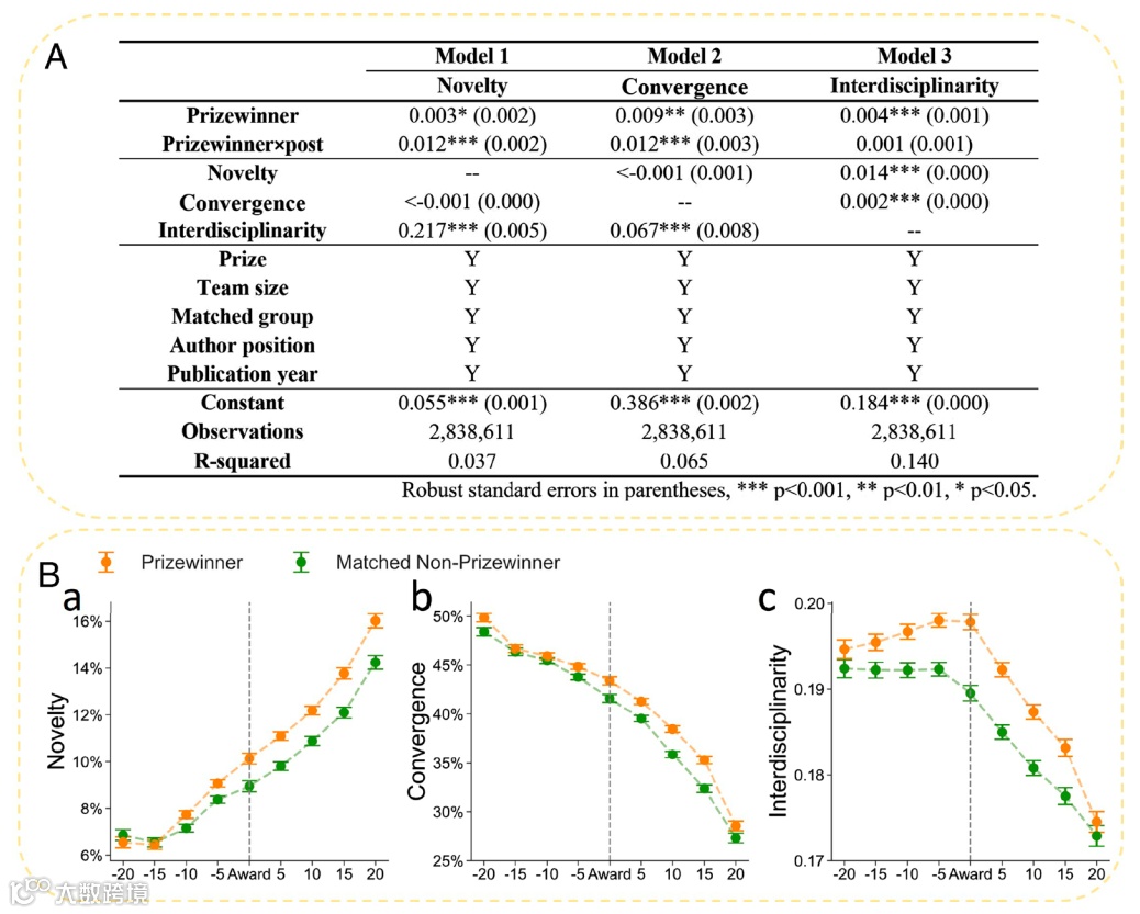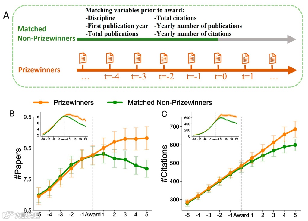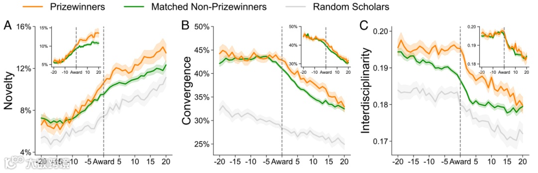 这项研究横跨百年,汇集了全球2460项科学奖项、7353位获奖者,并与超过1.6万名“影子对手”——那些在奖项颁发之前与获奖者在论文产量、引用次数、研究领域甚至职业生涯阶段都几乎旗鼓相当的未获奖科学家——进行了系统性比较。结果并不算出人意料:获奖者确实更“创新”,但他们的创新并非突如其来,而是在获奖前四到五年就已悄然萌芽,并在获奖之后持续领先。