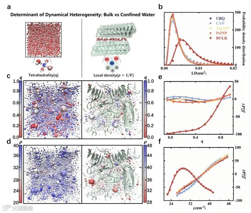 图1. 体积水 vs. 蛋白限域水的动力学非均一性对比。(a) 示意图展示造成动力学异质性的不同因素:体积水中取决于最近邻水分子的四面体构型有序度q;限域单层水中取决于单分子局部密度ρ。(b) 水分子局部扩散率的概率分布。可以看到限域水的局部密度分布略有不同但总体偏低密度。(c,d) 水的动力学非均一性快照:球体表示水分子,大小代表其局部扩散率(大球=运动更快)。颜色在(c)中表示四面体有序度q,在(d)中表示局部密度ρ。左侧是体相水,右侧为蛋白(PsINP)表面单层水,可以看出体相水中缓慢的蓝色水主要对应高q的结构,而限域水中缓慢区域更多受限于蛋白表面凹槽。(e,f)定量关联分析:e显示体积水中缓慢区域与四面体有序度q强相关(红色曲线随q增大而上升),但在各蛋白限域水中这种相关性很弱;f显示限域水中缓慢区域与局部密度ρ呈一定相关(不同颜色曲线趋势接近单调),而体积水中无明显ρ相关性。