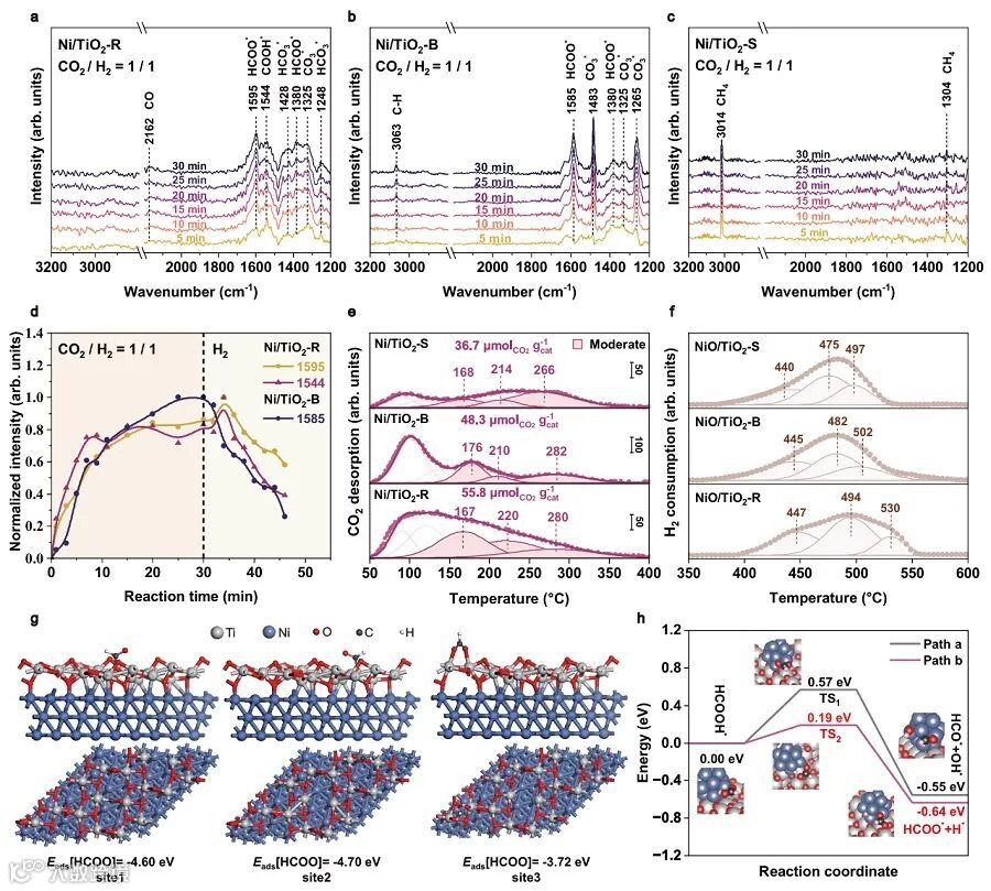 揭示“双重诱导”微观机制:结合原位红外、X射线吸收谱和理论计算,研究揭示了吸附质(甲酸盐物种)在A-SMSI形成中的双重角色:既参与还原TiO2形成覆盖层,又像“稳定剂”一样稳定该覆盖层。覆盖层形成后,会向Ni转移电子,并为关键的反应中间体COOH*提供合适的吸附位点,从而深刻影响反应路径。