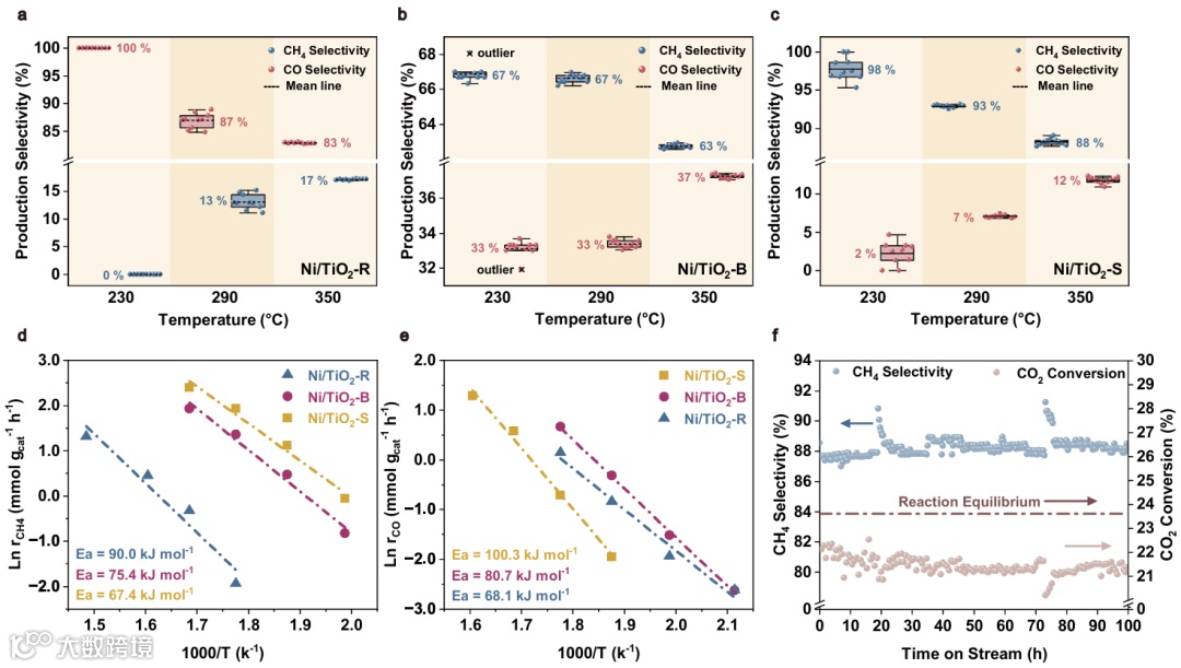 实现催化选择性的精准“导演”:上述微观机制的差异,直接决定了宏观反应产物的走向。得益于截然不同的界面结构:Ni/TiO2-{001}催化剂对甲烷的选择性超过88%,而Ni/TiO2-{100}催化剂对一氧化碳的选择性则超过83%。这首次清晰地证明了通过设计载体晶面来调控A-SMSI,进而实现产物选择性反转的完整逻辑链条。