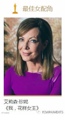 最佳女配角方面,和男配的情况一致。《我,花样女王》中饰演母亲的,艾莉森·珍妮荣获此项殊荣。恰巧的是,她和最佳男配角得主山姆·洛克威尔一样都是第一次提名就获奖,今年是这些配角戏骨们爆发的一年。