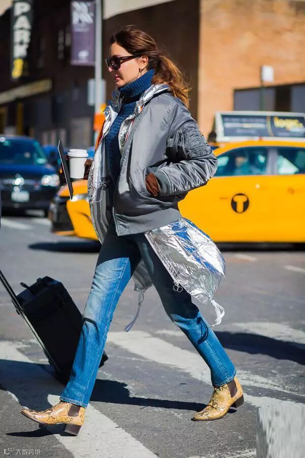 “怕冷的菇凉可是内搭一件高领毛衣,再来一件棒球外套,中间穿插一件亮色长外套,想不吸睛都难,穿上蓝色牛仔裤就OK了。这是一个实行起来低成本,不费力却能带来高关注度的穿法。”