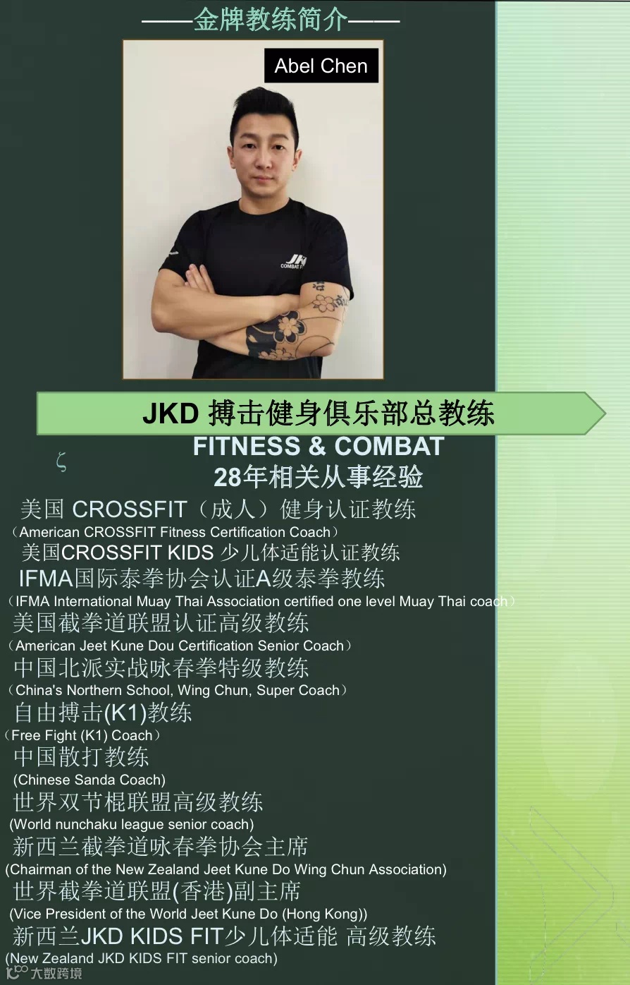 创始人Abel Cheng教练14岁开始习武,专长咏春拳(中国北咏春),截拳道(澳大利亚),自由搏击(中国职业队),泰拳(泰国金甲拳馆),拳击(新西兰)。