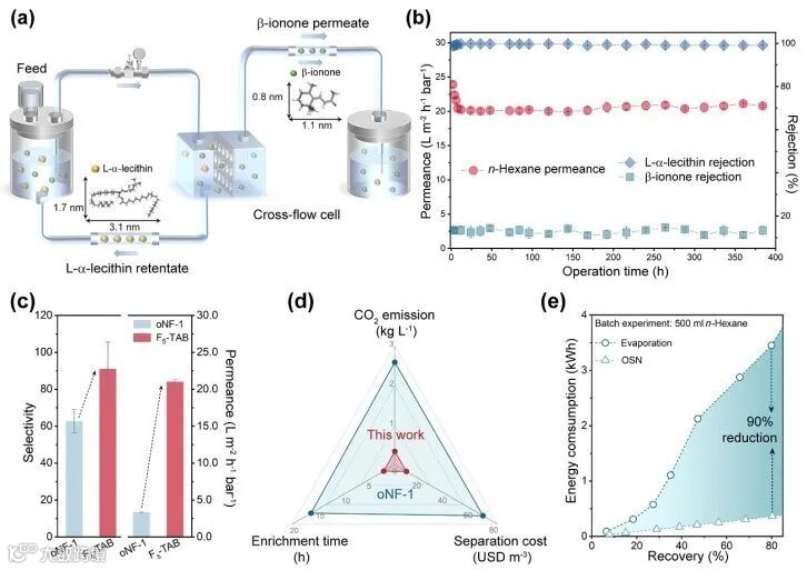 研究显示,Fx-CMP膜对多种高附加值活性药物成分均表现出超过99%的稳定截留率。其核心优势在于长期溶剂接触下无膜材料渗出现象,确保了制药工艺的安全稳定运行。针对市场需求广泛的L-α-卵磷脂与β-紫罗兰酮药物,进一步评估了大面积Fx-CMP膜的分离性能。值得一提的是,与商用BORSIG oNF-1膜相比,研究开发的Fx-CMP膜不仅将选择性提升了45%,同时正己烷渗透率提高约5.3倍,从而将分离成本降低约87%,并大幅减少了相应的碳排放。相较于传统蒸馏技术,基于Fx-CMP膜的分离工艺可降低90%的能耗。此外,该膜优异的机械稳定性允许通过提高操作压力进一步优化能耗表现。以上研究结果表明,Fx-CMP膜为高附加值药物分子的高效、低能耗分离提供了一条极具市场竞争力的技术新路径。
