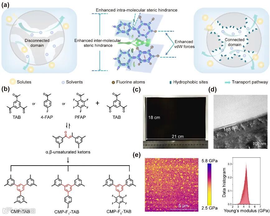 有机溶剂是现代化工生产体系的关键组分,作为反应、分离、提纯介质被广泛应用于新能源电池制备、药物合成与分离纯化、食品加工以及石化工程等领域。传统的精馏和萃取等分离工艺存在能耗高,操作繁琐,分离效率较低等问题。膜分离技术以低能耗且易操作等优势在化工分离中前景广阔,有望推动化工行业绿色低碳转型。然而,现有耐溶剂膜材料普遍存在分离性能、稳定性与规模化制备难以兼顾的挑战。凭借刚性π共轭骨架和稳定共价键连接,共轭微孔聚合物(Conjugated Microporous Polymer, CMP)表现出优异的结构与化学稳定性,但其制备过程通常依赖贵金属催化及苛刻反应条件,难以大规模生产。同时,现有方法对孔道化学环境的调控能力有限,常以牺牲孔道连通性或膜与溶剂间亲和力为代价,制约了整体分离性能的提升。