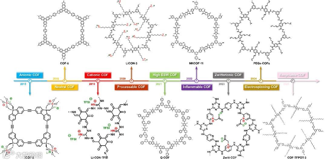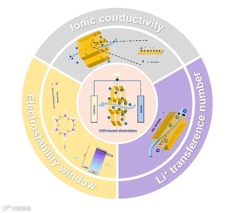 固态电池通过以固体电解质替代传统易燃的有机液态电解质,显著提升了电池的本征安全性。同时,固体电解质在抑制锂枝晶生长和拓宽电化学稳定窗口方面具有潜在优势,使其能够与锂金属负极相匹配,从而为实现更高的电池能量密度提供了可能。因此,固态电池被广泛认为是下一代高性能储能体系的重要发展方向。其中,固态电解质作为离子传输与界面调控的核心组成部分,是决定固态电池性能的关键材料。共价有机框架(COFs)由于其可设计的周期性骨架结构和规则分布的孔道,能够构筑高度有序的离子传输路径,在特定结构类型中可形成沿晶轴方向延伸的一维离子传输通道,使其成为极具潜力的固态或准固态电解质材料。