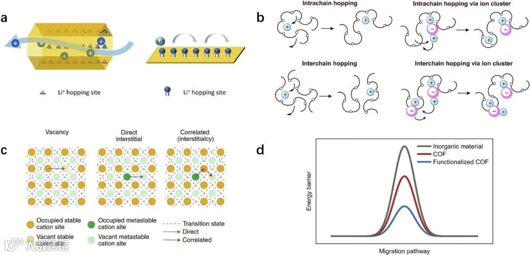 图3. a) 共价有机框架(COF)基电解质孔道中的离子传输。b) 聚合物材料的离子导电机制。c) 无机材料的离子导电机制。d) 无机材料、COF 及功能化 COF 的离子导电能量壁垒图。