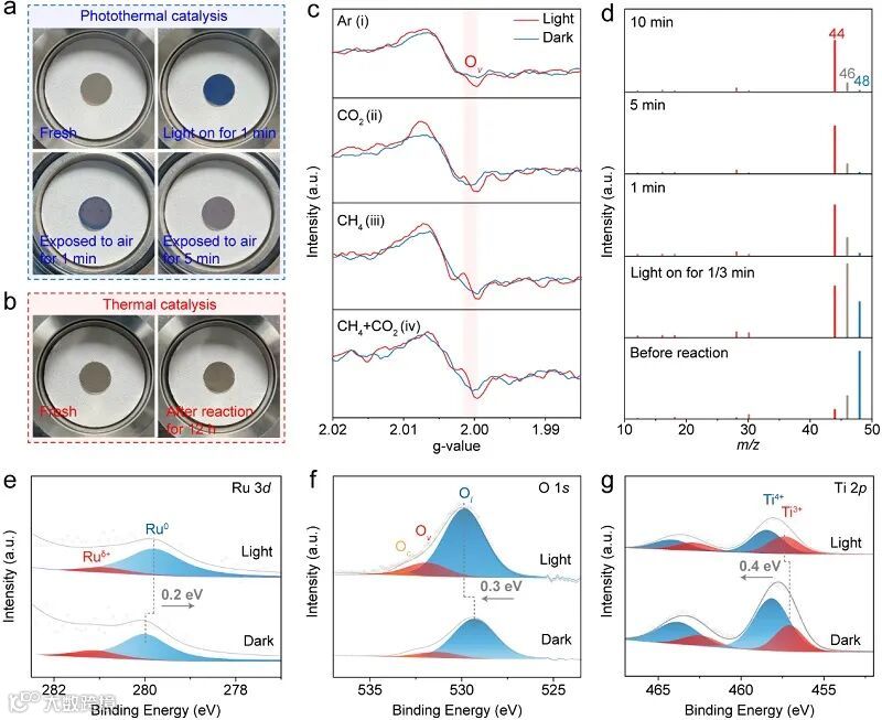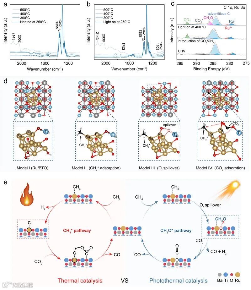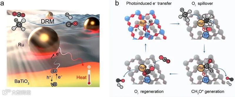 图1. 通过光致晶格氧溢流效应实现Ru/BTO光热催化DRM的示意图。