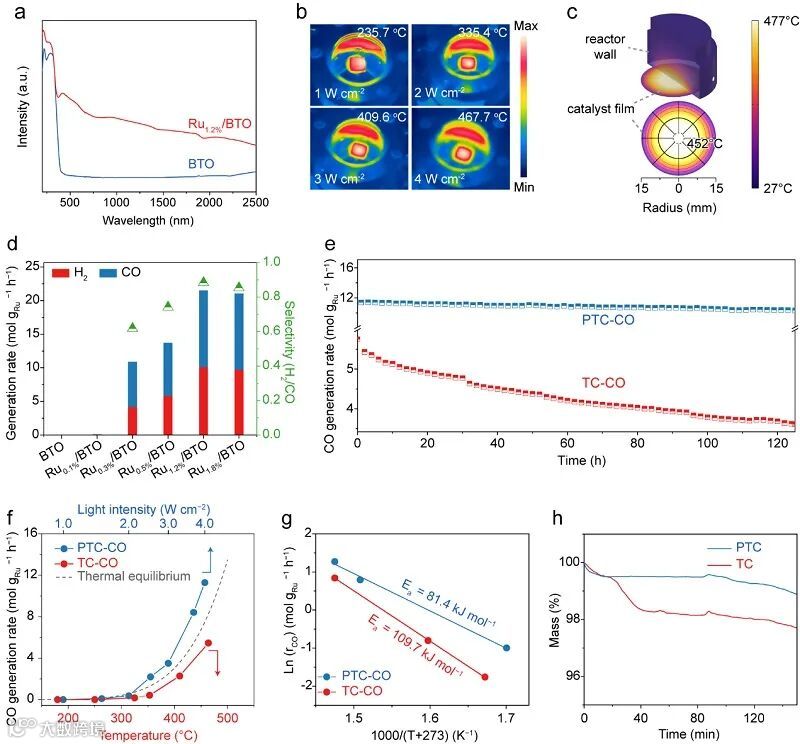 图3. Ru/BTO 在光热催化(PTC)和热催化(TC)条件下的DRM性能。