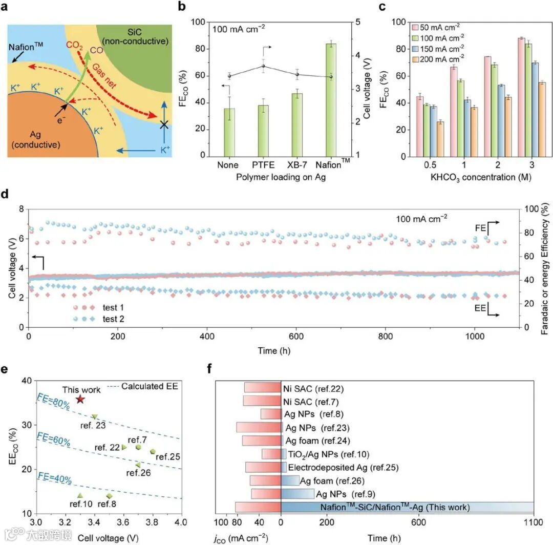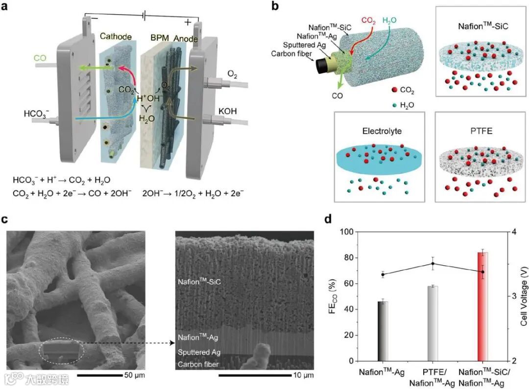 图2. NafionTM–SiC分层电极界面传输及碳酸氢盐电解性能。