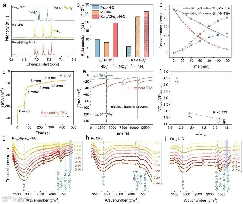 同位素竞争实验显示,在单独Ru NPs上,NO2⁻优先被还原,而在FeSA–N–C上,NO3⁻更易被还原,这表明Fe位点与Ru位点在NO3⁻RR中发挥协同作用,空间耦合的功能互补位点形成连续的串联反应路径,高效将NO3⁻转化为NH3。动力学分析显示,FeSA–N–C上NO3⁻向NO2⁻转化迅速,但后续NO2⁻氢化较慢,导致NO2⁻积累。而在RuNP@FeSA–N–C上,*NO2中间体优先在Fe位点生成,邻近的Ru位点提供局域富*H环境,实现*NO2的深度氢化,这解释了其对NH3生成的高选择性。通过引入*H捕获剂叔丁醇(TBA)发现,TBA的加入会明显抑制NO3⁻转化和NH3生成,进一步证明*H在反应中不可或缺。反应中后期,NH3产量与总电荷呈线性关系,显示电子耦合质子转移在维持高选择性转化中起主导作用。FTIR光谱研究进一步揭示了反应机理:Ru位点能够显著增强活性氢的生成和覆盖,并将部分*H溢出到相邻的Fe位点,使NO2⁻等中间体得到高效氢。相比之下,单金属Ru表面活性位点主要被*H物种占据,阻碍了NOx在催化剂表面的吸附,并且由于*H相对过量,在较高的过电势下容易发生析氢。这说明,Ru和Fe位点的协同作用以及*H的动态调控,是RuNP@FeSA–N–C实现高选择性NO3⁻还原生成NH3的关键因素。