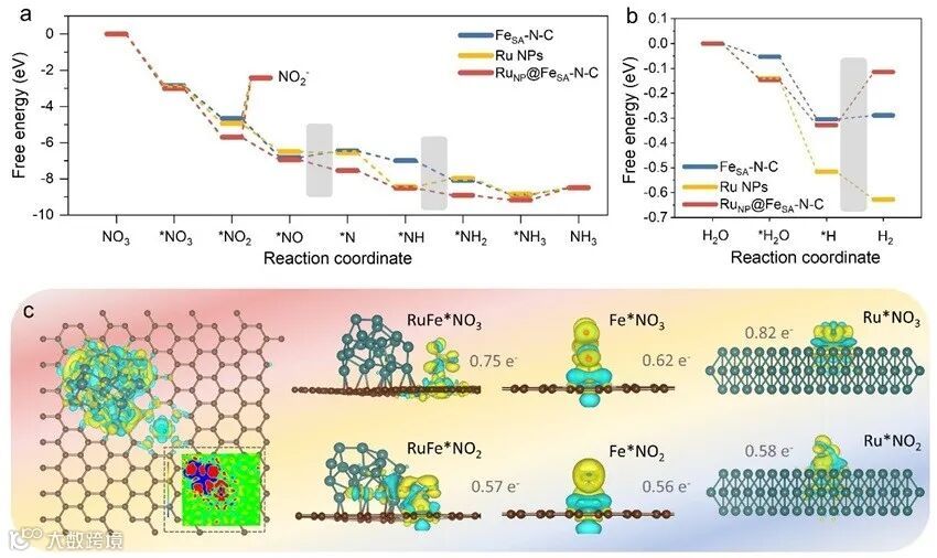 对于 FeSA–N–C,*NO 向 *N 的转化是速率限制步骤,受制于 *H 供应不足;而在 Ru 上,*NH→*NH2的高能垒源于过强的 *H 吸附,阻碍后续氢化并降低 NH3选择性。引入 Fe 后,可有效削弱 Ru 位点的 *H 束缚,使其在保持足够 *H 供应的同时提升氮中间体的深度氢化能力,从而增强整体反应活性。Bader 电荷分析表明,在 RuNP@FeSA–N–C 界面形成显著电荷积累,强化了单原子位点与纳米颗粒位点之间的电荷转移,调控了二者的吸附特性。关键中间体的电荷密度差异进一步说明复合界面的金属–氧结合强度适中,兼顾吸附与解离,更符合 Sabatier 原则。水解离自由能结果显示,Ru NPs和RuNP@FeSA−N−C表面上的Volmer步骤表现出比Fe表面更大的自由能下降,表明水分解(*H生成)能力显着增强。此外,*H到H2的非自发过程也意味着其优越的*H保留能力,相应地通过Heyrovsky机制发生HER的概率较低。
