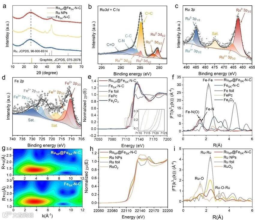 为深入揭示Ru纳米颗粒与Fe单原子位点之间的电子结构特征及界面相互作用,研究团队结合XRD、XPS、XANES与EXAFS等多种谱学手段开展了系统分析。XRD图谱显示材料中主要可分辨出Ru的金属特征衍射峰,而未观察到Fe相关的晶相信号,说明Fe以高度分散的单原子状态存在,与前述HAADF-STEM的直接成像结果相一致。XPS分析进一步揭示了两种活性组分之间的电子调控特征。相比单独的FeSA–N–C体系,RuNP@FeSA–N–C中Fe 2p的结合能出现轻微正移,而Ru 3d的结合能则呈现相应的负移,这种反向偏移趋势表明Fe与Ru之间存在电子重新分布,即Fe–N4位点发生一定程度的电子向Ru的迁移。X射线吸收精细结构(XAFS)分析显示,Fe在RuNP@FeSA–N–C中的配位环境与FeSA–N–C类似,但主峰强度增加,平均配位数由4.1升至5,提示Fe–O–Ru界面的形成,有效锚定Ru纳米颗粒并实现界面电子耦合。Ru K边EXAFS显示,Ru纳米颗粒保留Ru–Ru路径,同时Ru–O配位增强,进一步验证了Ru与Fe之间的电子相互作用。整体结果确认,RuNP@FeSA–N–C成功构建,其中原子分散的Fe通过氧桥与Ru纳米颗粒连接,实现稳定的界面结构和有效的电子调控,为催化性能提供坚实基础。