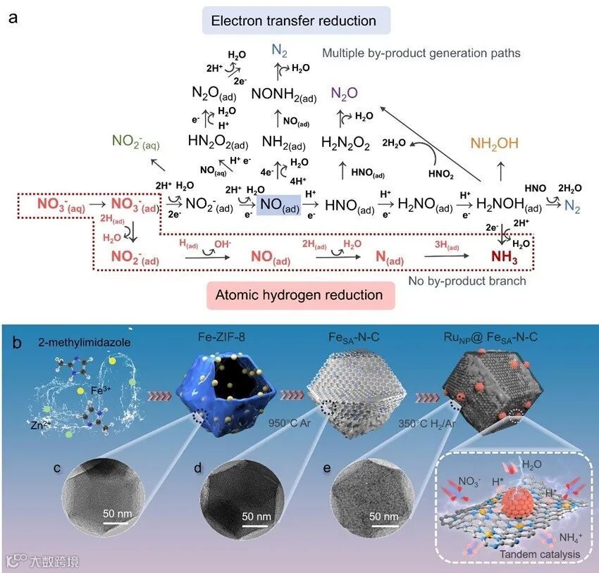 研究首先基于对硝酸盐还原反应路径的深度理解,提出“功能分区 + 空间耦合”的界面设计理念。硝酸盐的逐步脱氧–氢化路径具有显著的位点功能差异性:NO3⁻/NO2⁻等氧化态中间体更适合由电子结构可调、配位环境稳定的 Fe–N4位点吸附与活化,而氢化步骤则要求丰度高且反应动力学快的 *H 供给源。基于此,研究构筑了将 Fe 单原子嵌入 N 掺杂碳基底,并在其表面原位锚定 Ru 纳米颗粒的复合结构,从而在原子尺度上实现两类功能位点的协同。二者通过可控界面距离实现快速的电子与氢物种传输,最终形成贯穿整个反应链的级联催化网络。