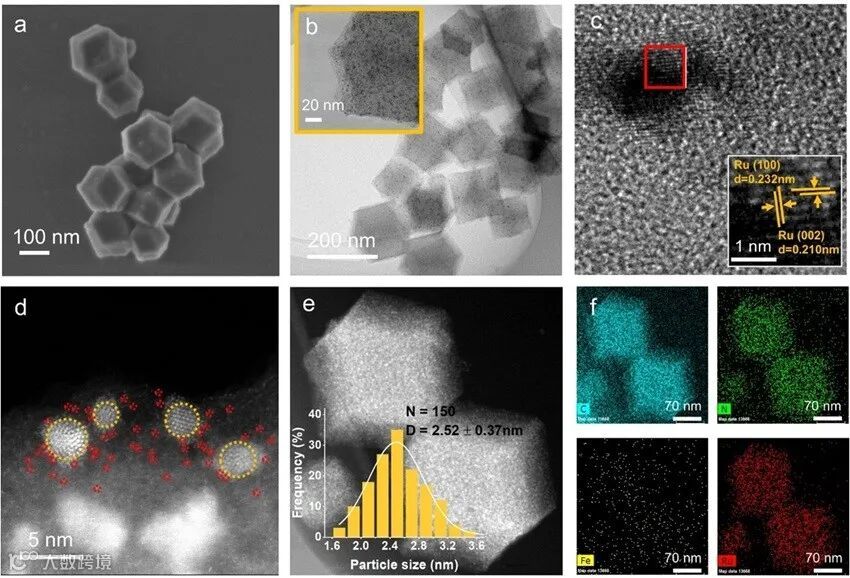 催化剂的构筑遵循“结构可控衍生+单原子锚定+纳米颗粒原位生长”路线。首先,利用 ZIF-8的笼状结构将Fe均匀引入MOF框架中;在高温热解过程中,ZIF-8碳化为结构稳定的N掺杂多孔碳材料,同时Fe通过与N的强相互作用形成热力学稳定的Fe–N4配位结构,实现单原子尺度锚定。随后通过浸渍–化学还原法,将Ru前驱体均匀负载并原位还原为纳米级Ru颗粒。通过对Ru负载量的控制,获得了Ru纳米颗粒与Fe单原子位点在空间尺度上的有序排列,构成了实现级联反应的关键界面基础。基于多尺度电子显微表征,催化剂的微观结构得到了系统确认。SEM显示其保持了前驱体的多面体碳框架形貌;TEM与HRTEM进一步证实Ru纳米颗粒封装于碳基骨架的笼状腔体内,且具有明确的晶格条纹特征。此外,HAADF-STEM高角环形暗场成像结合元素映射结果显示,在这些Ru纳米颗粒所处的石墨化碳层周围分布有以孤立亮点形式呈现的原子级Fe信号,证明Fe以高度分散的单原子形式稳定锚定于碳基骨架并 Ru纳米界面形成紧密关联。