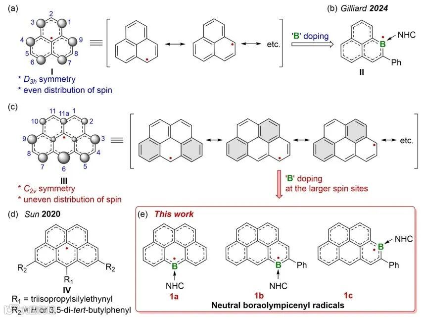 具有单个离域未成对电子的多环芳烃(PAHs)作为自旋1/2石墨烯片段,展现出了独特的磁学和光电性质,因此在响应材料、分子电子器件等前沿领域中具有重要的研究价值。与自旋分布均匀且对称性较高的非那烯自由基(Phenalenyl radicals)相比,具有较大π共轭体系的奥林匹烯基自由基(Olympicenyl radicals)表现出显著的不均匀自旋分布特征。这种不均匀性赋予了奥林匹烯基自由基更丰富的化学反应性和物理性质,同时可以通过结构修饰来进一步调控其电子结构特征,从而拓宽其应用场景,因此引起众多课题组的关注。其中,孙哲教授课题组在全碳型奥林匹烯自由基的分离与性质研究方面取得了一系列重要进展(J. Am. Chem. Soc., 2020, 142, 11022;Angew. Chem. Int. Ed., 2023, 62, e202313257;ChemPlusChem., 2024, 89, e202300571)。此外,主族杂原子特别是硼原子因其独特的电子性质,在调控分子电子结构及晶体堆积类型等方面展现出独特的优势。曾泽兵教授课题组首次将硼原子引入到奥林匹烯基自由基的11a位得到阴离子型硼杂奥林匹烯自由基,研究结果显示硼原子在调控电子结构方面具有独特优势(Chem. Sci., 2023, 14, 4158)。然而,关于中性硼杂奥林匹克烯自由基的研究尚未报道,限制了人们对硼杂自由基调控方面的深入理解。
