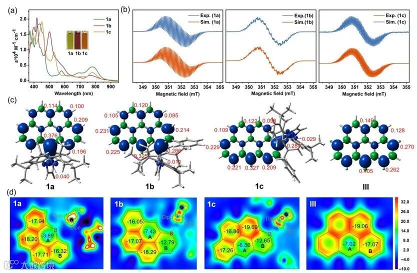 图3. 1a-c的紫外-可见吸收光谱(a)、电子顺磁共振图谱(b)、自旋密度分布图(c)以及2D-ICSS(1)zz平面图和NICS(1)zz值(d)