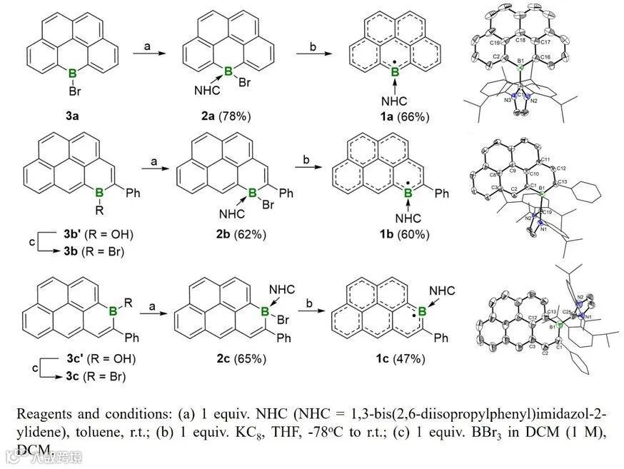 研究团队针对自旋密度分布较高的3位、5位和6位,通过精准设计合成路径,成功制备并分离出三种单个硼原子掺杂的中性硼杂奥林匹烯自由基1a–c,并对其进行了详细表征,其中单晶结构分析确认了其中心骨架呈共平面结构。