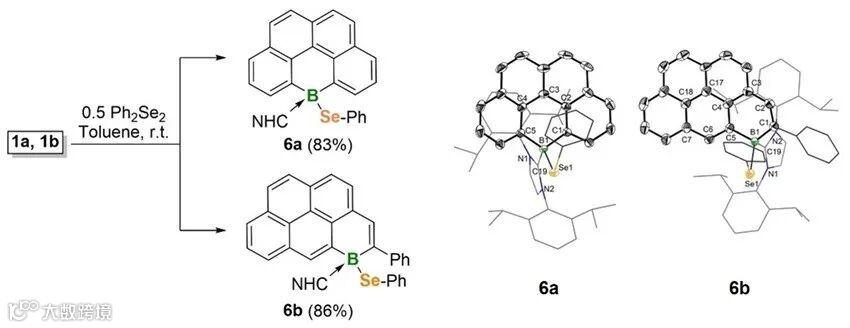 图6. 1a和6b与Ph₂Se₂的反应性研究及产物6a和6b的晶体结构