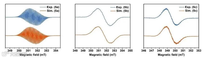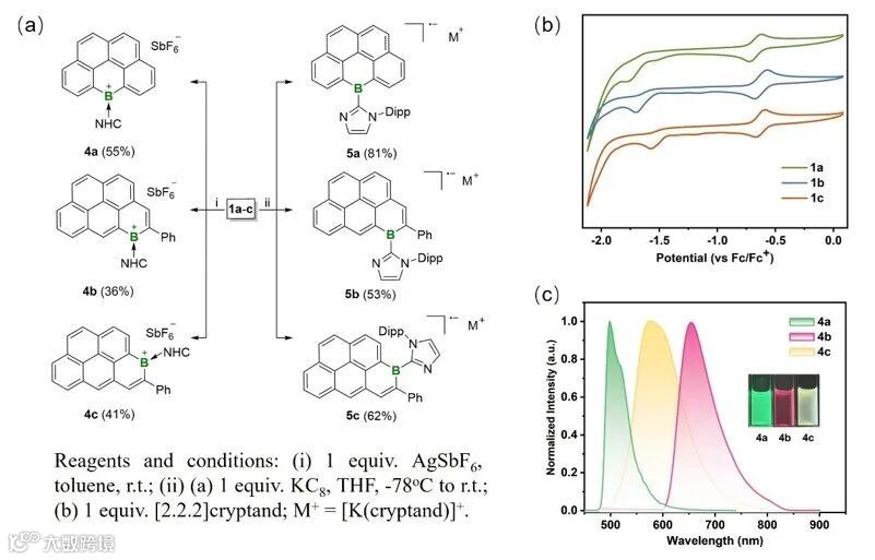 循环伏安测试表明,自由基1a–c均表现出可逆的单电子氧化特性(以Fc/Fc⁺为参比电极,半波电位分别约为−0.67 V、−0.64 V、−0.63 V),而还原过程则呈现不可逆特征,表明其氧化态与还原态物种之间存在显著的稳定性差异。在氧化条件下(以AgSbF₆作为氧化剂),成功分离得到阳离子型硼杂奥林匹克烯型多环芳烃4a–c。值得注意的是,4a–c展现出丰富的荧光发射性能,发射峰分别位于约498 nm、654 nm、579 nm处,相较于中性芳烃具有明显的红移,为有机光电材料的设计提供了新方向。同时,与电化学测试中观察到的不可逆还原现象一致,自由基1a–c在石墨钾(KC8)作用下并未生成预期的“硼中心还原产物”,而是引发了NHC配体的活化过程。经过配体中N–CDipp键均裂、C=N键形成等过程,最终生成结构独特的阴离子型硼杂奥林匹烯自由基5a–c。EPR测试进一步确定了5a–c的自由基性质,为这一非常规还原路径提供了关键证据。同时,理论计算结果显示最大电子自旋密度仍位于中心骨架的6位,但与硼中心相连的碳中心的自旋密度显著降低,表现出与1a–c明显的区别,进一步揭示了中性与阴离子型硼杂奥林匹克烯自由基之间的显著差异。