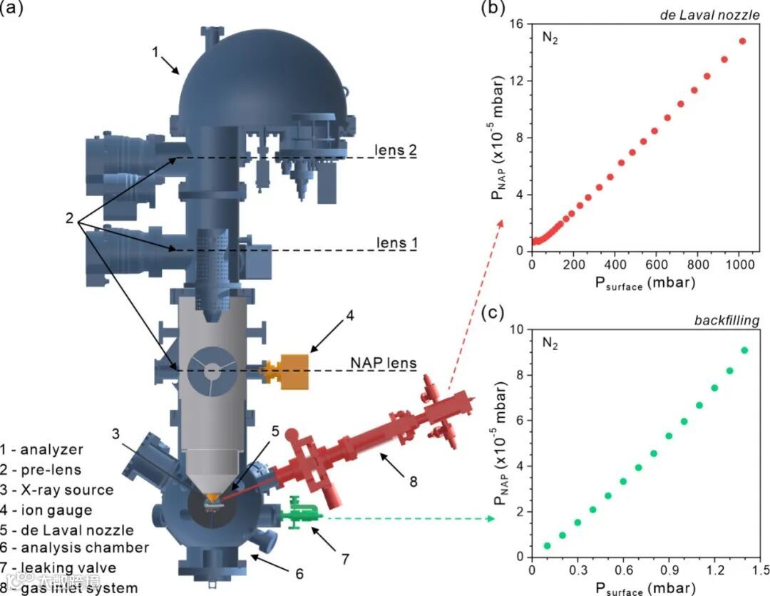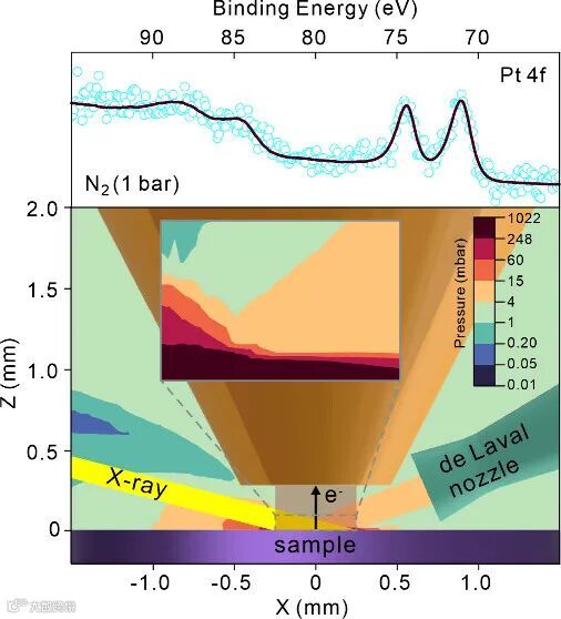 为突破这一限制,近常压 XPS(AP-XPS)应运而生。通过差分抽气技术在样品区与分析器之间维持巨大的压力差,AP-XPS 实现了在气体环境中对材料表面的原位表征。随着同步辐射高通量、小光斑、高能量X射线源和多级静电透镜等技术的发展,AP-XPS 的工作压力逐步提升,但在实验室软 X 射线条件下实现真正的常压(1 bar)测量仍极具挑战。