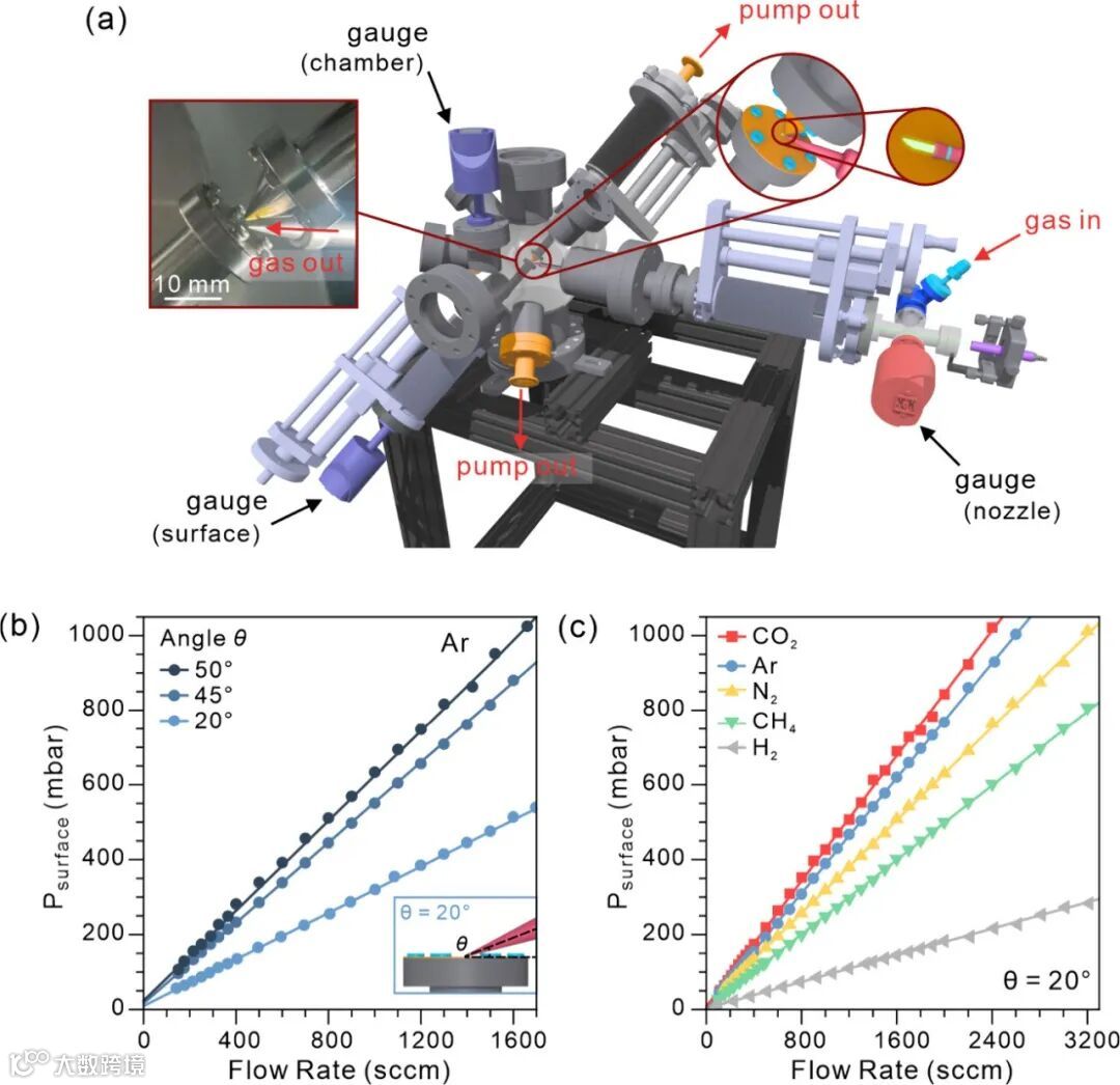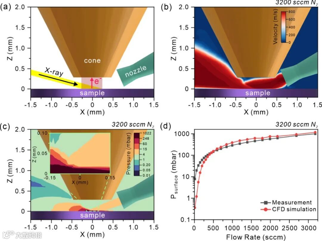 为了在实验室条件下实现1 bar级别的原位表征,研究团队设计了一套精密的高压气体注入系统(图1)。系统集成X/Y/Z三轴高精度位移台与核心部件——拉瓦尔喷嘴(de Laval nozzle),用于在样品表面构建高度局域化的高压反应环境。