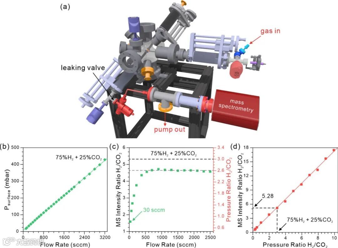 2)气体组分校准(Composition Calibration):在混合气反应中,不同分子扩散速率差异会导致表面实际组分偏离配气比例。例如 H2 的扩散速度远快于CO2,可能在某些流动条件下造成表面组分的系统性偏差。团队引入在线质谱(MS)进行定量校准(图3),并观察到:在更高流速下,表面组分逐渐趋近输入比例(如H2/CO2由3.0偏离至约 2.6)。该结果为后续催化动力学分析提供了可用于修正的定量依据。
