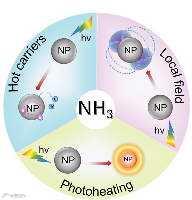 氨,是一种重要的大宗化学品,也是工业化肥的主要原料,在人类的生产生活中占据着重要地位。目前工业合成氨延用一百多年前的Haber-Bosch过程,利用Fe基催化剂在高温高压的反应条件下,催化氮气和氢气生成氨,该反应过程存在低效率,高能耗,对反应设备要求高以及环境不友好等问题。近年来,光催化作为新兴的合成氨反应途径,能够在温和条件下实现氮气活化并应用于合成氨。而局域表面等离子体共振效应作为调控光场的新技术,在光催化领域得到了广泛应用。
