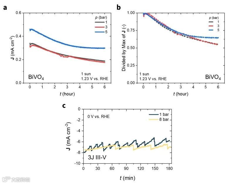 图5. BiVO4光电极和3J III-V光电极在不同压力下的稳定性测试结果。图片来源:Nat. Commun.