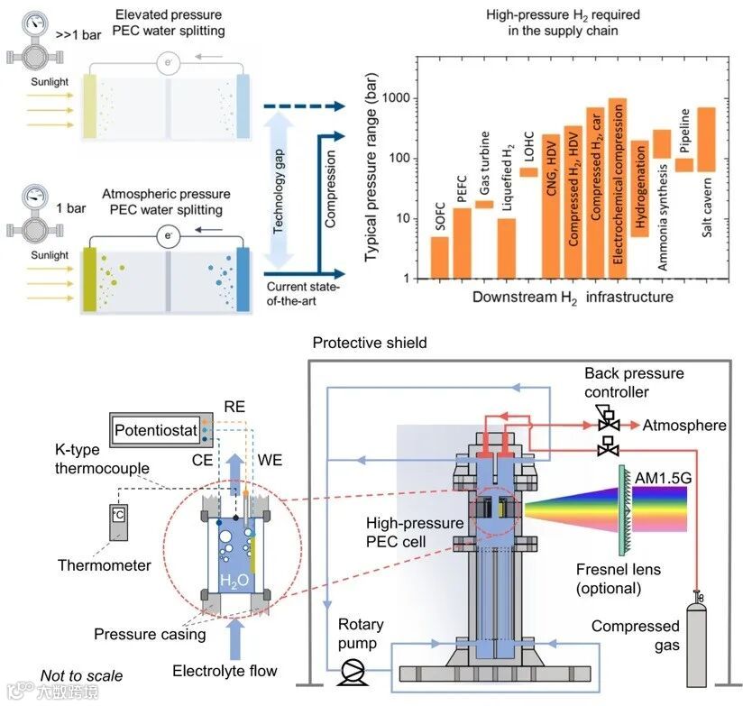 图1. 研究背景和高压光电化学分解水实验装置。图片来源:Nat. Commun.