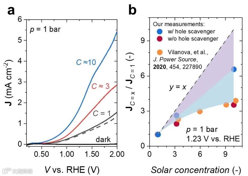 图2. 常压下基于BiVO4光电极的PEC反应装置在不同光照强度下的性能表征结果。图片来源:Nat. Commun.