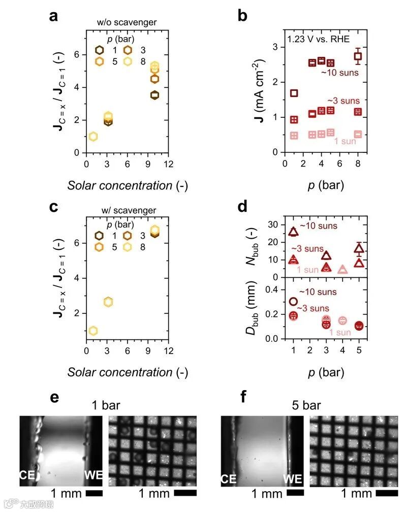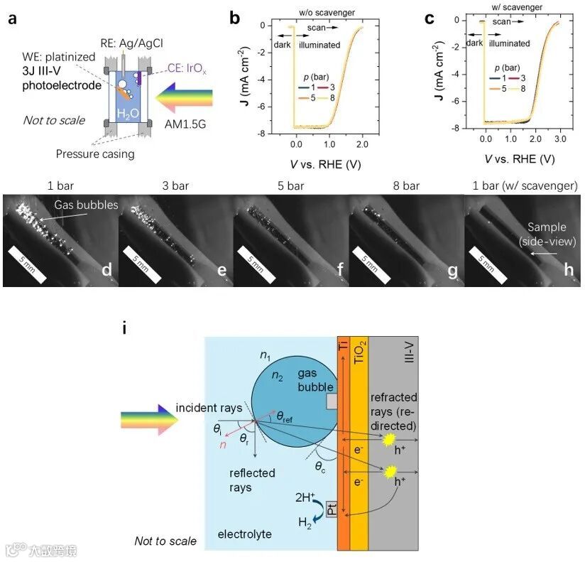 图4. 不同压力下基于3J III-V光电极的PEC反应装置在AM1.5G光照下的性能、气泡原位观测结果与机理分析。图片来源:Nat. Commun.