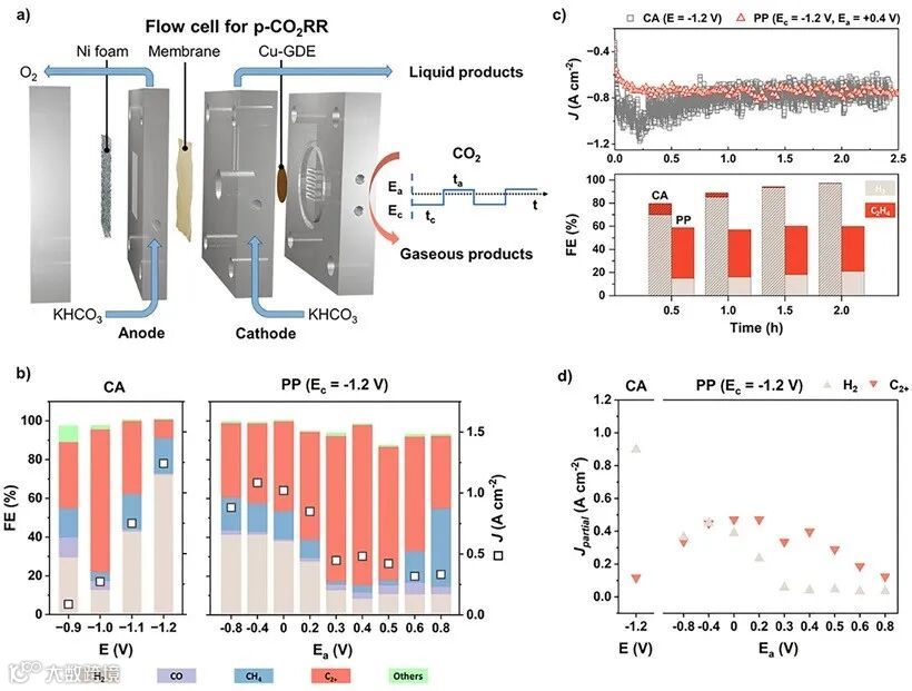 图1. 脉冲电解在工业级电流密度下显著提升 CO2 电还原至多碳产物选择性