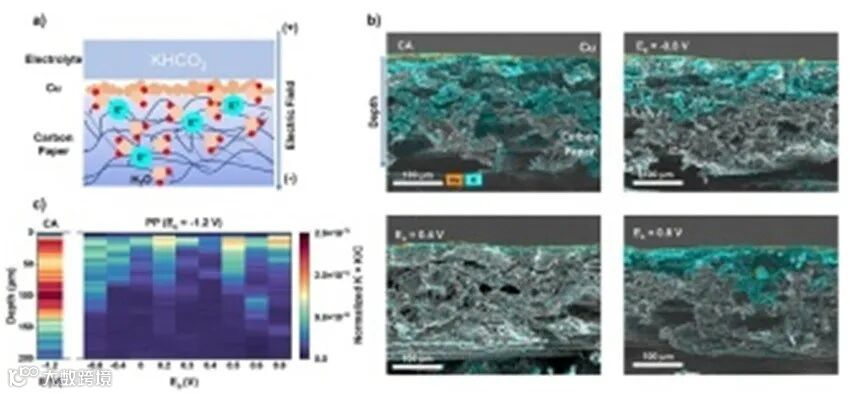 以K+作为电解液渗透示踪离子,横截面 SEM-EDS结果表明,相比恒电位条件,脉冲电位输入显著降低了电解液向GDE内部的渗透深度,使K+主要分布于电极表层(图3 a-b)。定量K+深度剖面显示,在脉冲条件下电解液渗透随Ea呈非单调变化,在Ea= +0.4 V时达到最小,其变化趋势与C2+法拉第效率高度一致,表明界面水淹抑制是脉冲增强C2+生成的关键机制(图3c)。