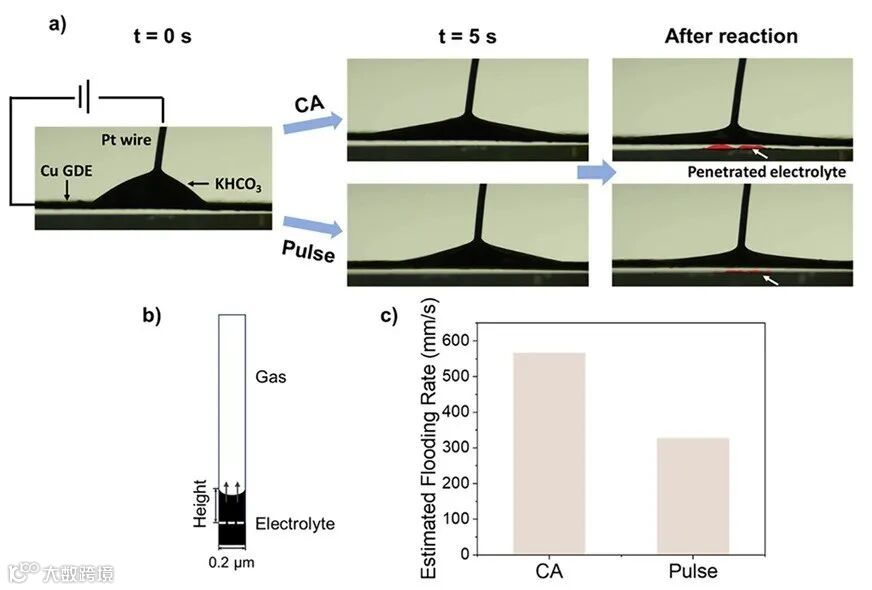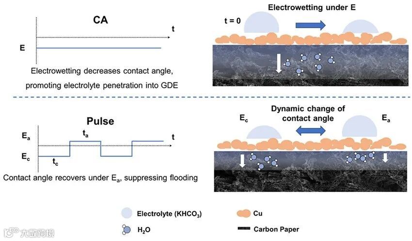在恒电位(CA)操作中,电场诱导的界面电润湿使GDE–电解液界面接触角持续降低,驱动电解液不断渗入多孔电极,最终导致电极水淹并阻碍CO2向活性位点的传质。脉冲电位策略在阳极脉冲阶段(Ea)周期性恢复电解液接触角,削弱电润湿与毛细驱动力,从而有效抑制电解液水淹;在阴极脉冲阶段(Ec),稳定的三相界面促进CO2供应,实现显著提升的CO2→C2+转化效率。